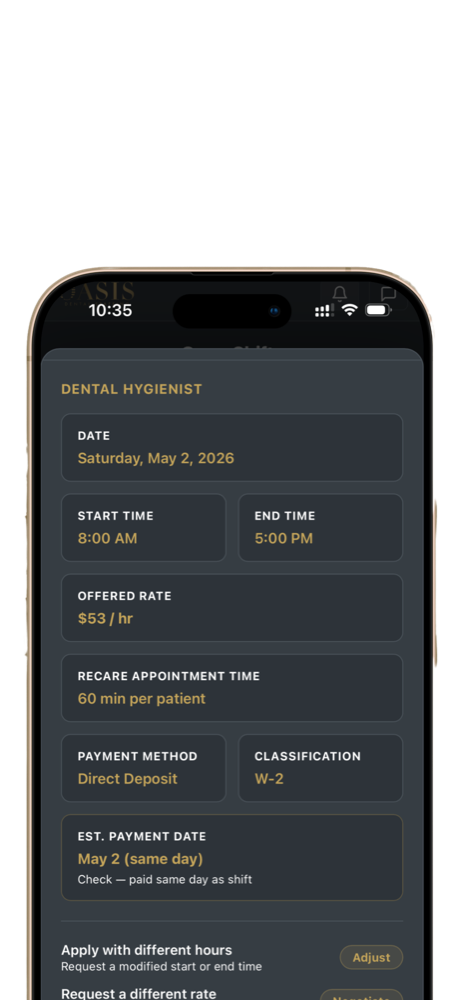 Oasis connects dental professionals with flexible job opportunities through our platform, and provides one-on-one coordination for dentists.